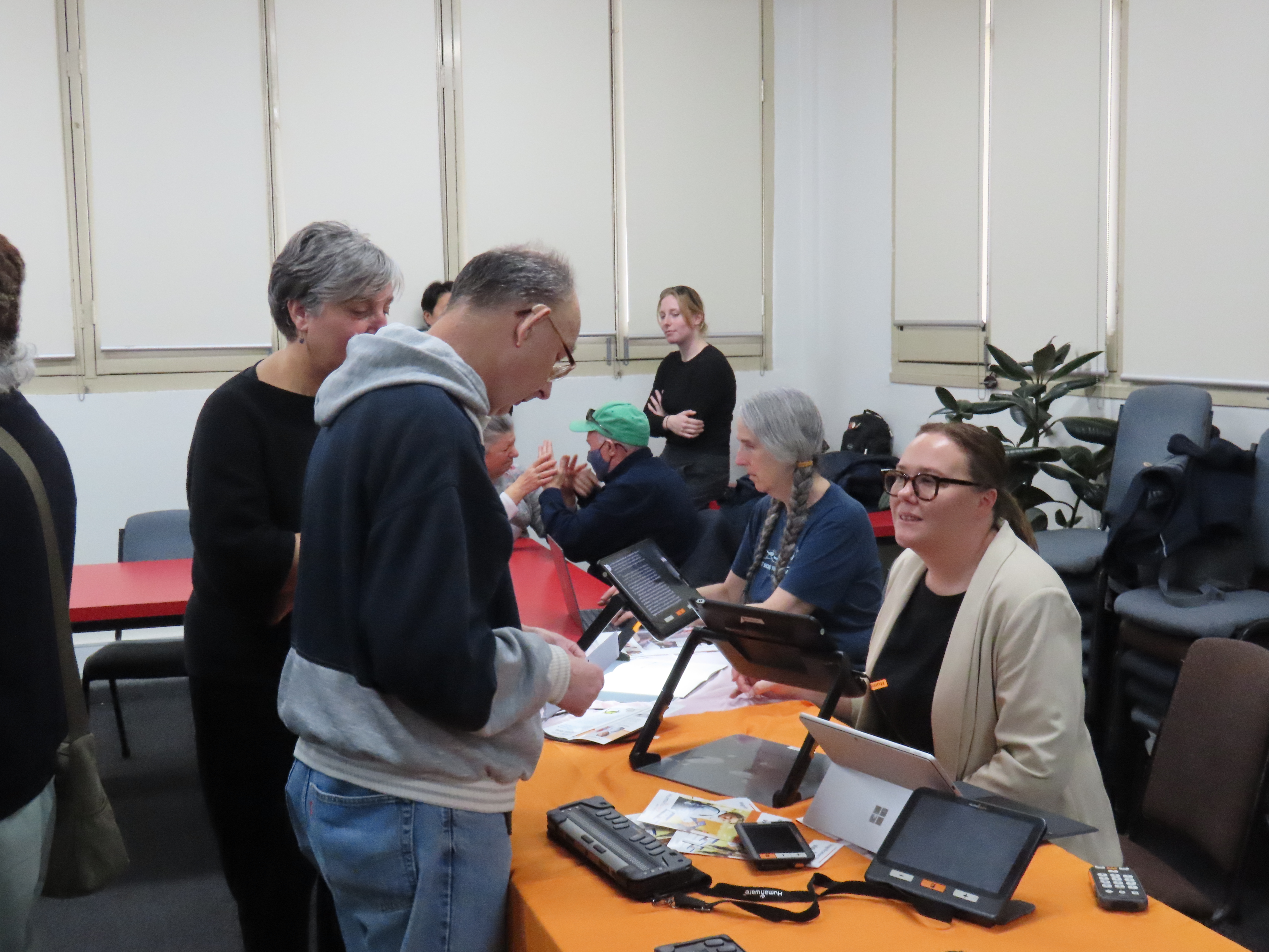 During July 23 Deafblind Victoria Café held an exciting technology day for the Victorian Deafblind community. There were many people who attended the event and the fourth floor meeting room was very busy with many Deafblind members looking at various types of technologies.